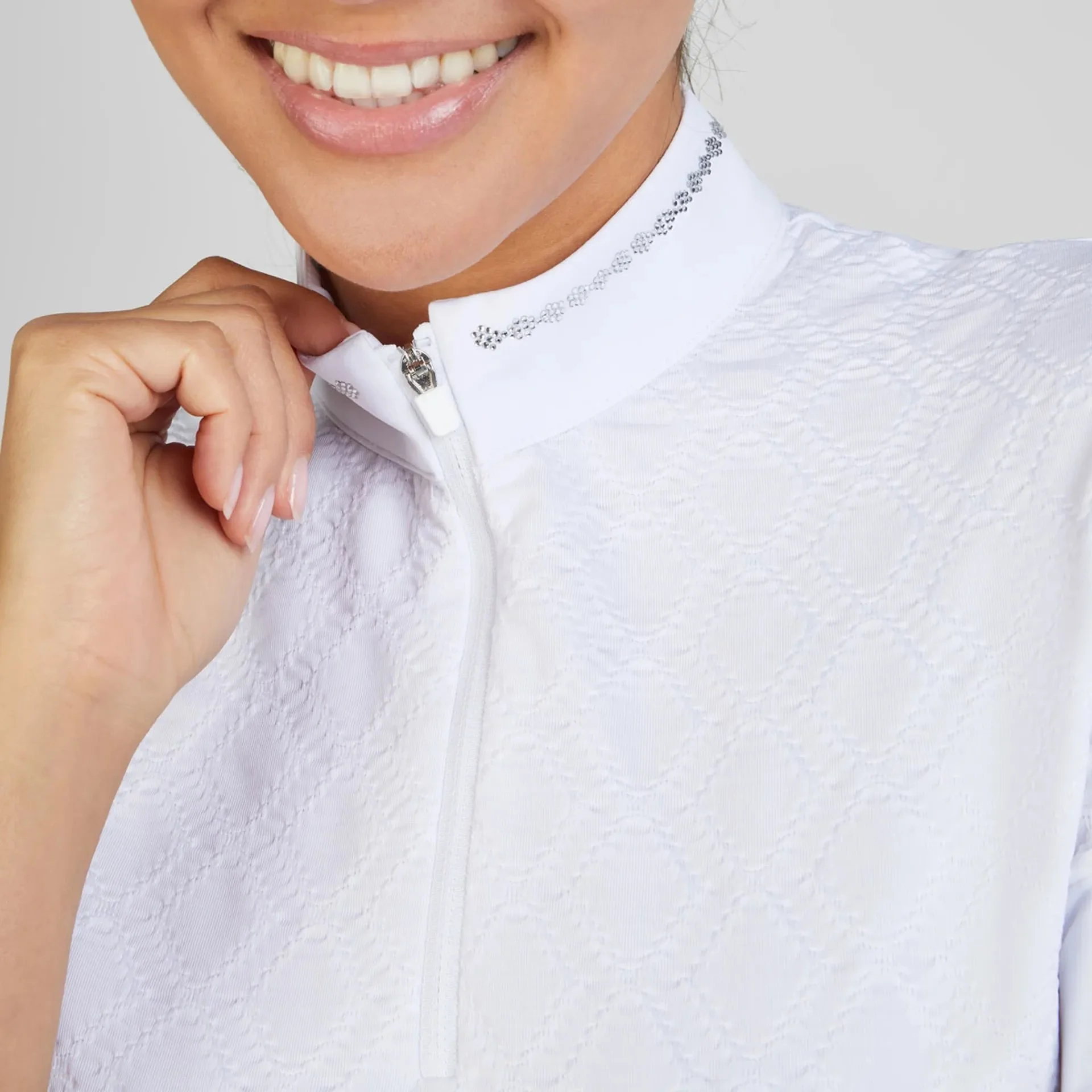 Elegant performance in every detail. Made from stretch, breathable fabric, this competition shirt ensures comfort and a flawless fit. The hidden snap buttons keep the silhouette clean, while jewel buttons at the collar and cuffs add a polished finish. Delicate stretch tulle on the sleeves offers both ventilation and sophistication. The front placket is enriched with soft plissé and sparkling crystal rhinestones, perfectly matched by the rhinestone logo on the collar. Quick-dry technology makes it as practical as it is refined.
